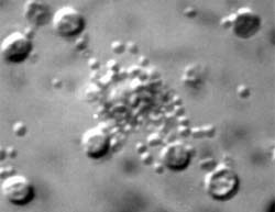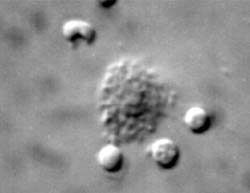 In 1972, I presented a poster session with my major Professor, Dr. Bob Leif, at the annual Reticuloendothelial Society Meeting. On my poster, I presented on very unusual cells from the spleen (and later from the lymph nodes) of non-immunized mice that destroyed sheep red blood cells (SRBC) on contact. I came very close to publishing the article in Science which took some time and effort, but the conclusion was that it was more suitable for the immunology journals. The papers were accepted in the Journal of Immunology. I did not know the proper name for these cells but was able to develop a way of enumerating them, determine their density and enrichment in linear bovine serum albumin gradients and study their morphology utilizing light, scanning electron and transmission electron microscopy. Many years later, I developed a clinical application by in vitro enriching natural killer cells for infusion into patients. Currently, I am investigating natural substances that are supposed to increase the natural killer cell response. Unlike complement mediated IgM antibody destruction of SRBC, which showed lyses of "plaques" of SRBC appearing as deflated balloons (Fig. 1), the complete destruction of the SRBC did not require prior immunization with SRBC or complement (Fig. 2). Thus, I gave them the name "complement independent plaque-forming cells" (CIPFC) or "rough lymphocyte plaque-forming cells" when I was able to perform scanning electron microscopy (SEM). Later, Heberman (1973) and Oldham (1973) used the term "Natural Killer Cell".